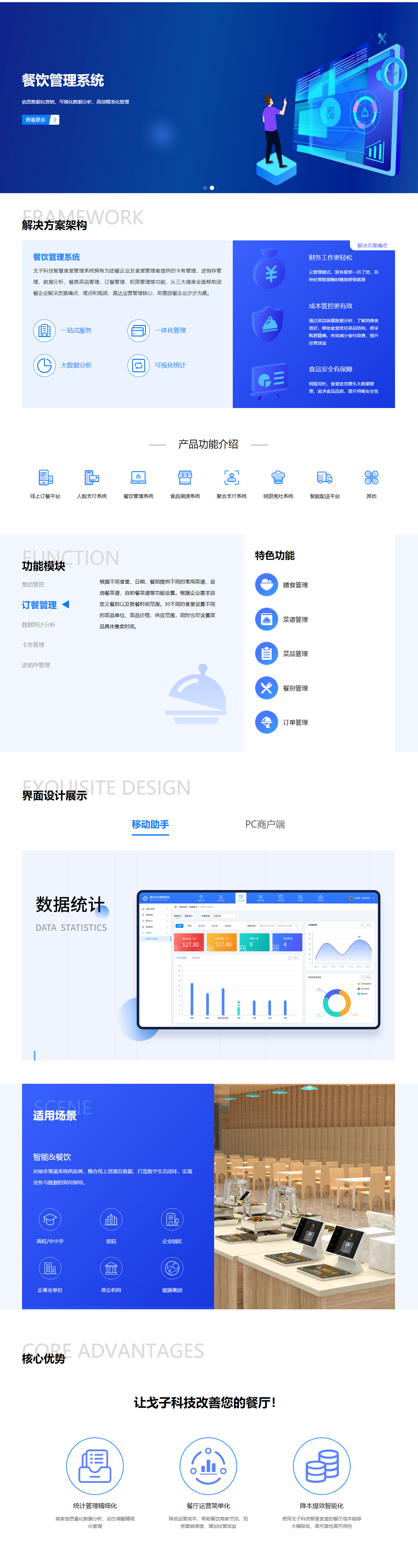 戈子科技智慧食堂管理平臺(餐飲管理系統)是一款涵蓋了食堂管理全流程的智能管理系統:擁有人員管理、用餐管理、財務管理、自建線上食堂,專業輸出全流程閉環式的功能,為夠您提供最高效便捷的管理方案。適用于政企單位、醫院、中學、高校、團餐公司、中央廚房等不同業態,滿足您的個性化需求,精準備餐,減少浪費;自動化功能,減少人力,幫助政企單位實現綠色高效管理。