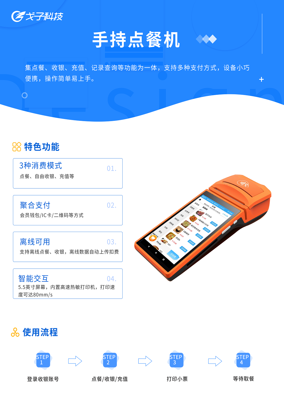 手持機適用于餐飲,零售,商超,生鮮,日化等收銀場景,提供軟硬一體化產品支持預訂,排隊叫號,點菜收銀,會員營銷,報表等服務!