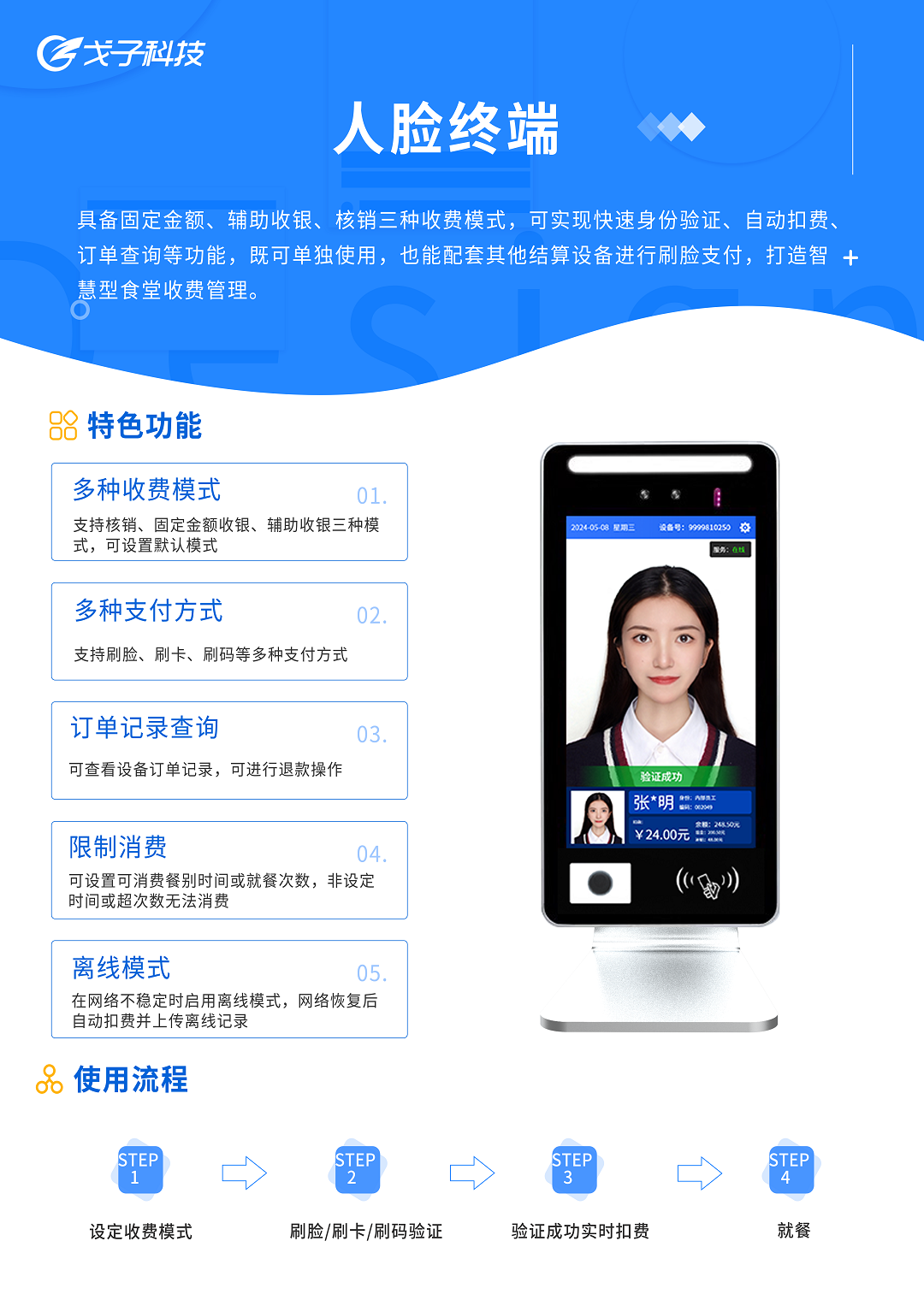 戈子科技人臉識別終端利用AI智能人臉識別技術,專業提供精準實時的人臉檢測,分析,識別等功能,其用于食堂快速收銀的人臉識別就餐管理,支持刷卡,掃碼和人臉支付,測評準確度高達99.80%,覆蓋多種企業場景,高效解決企業常見痛點。