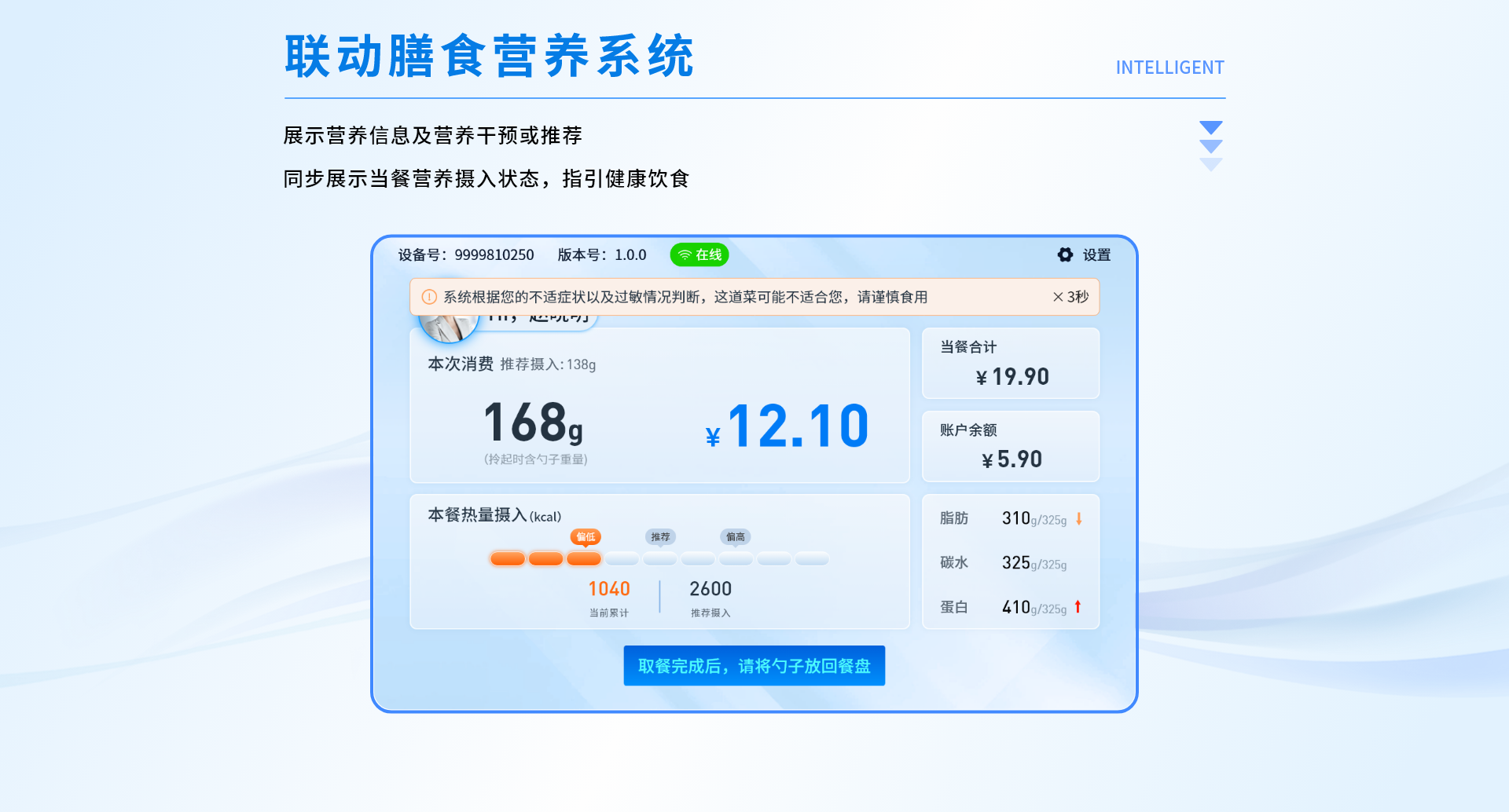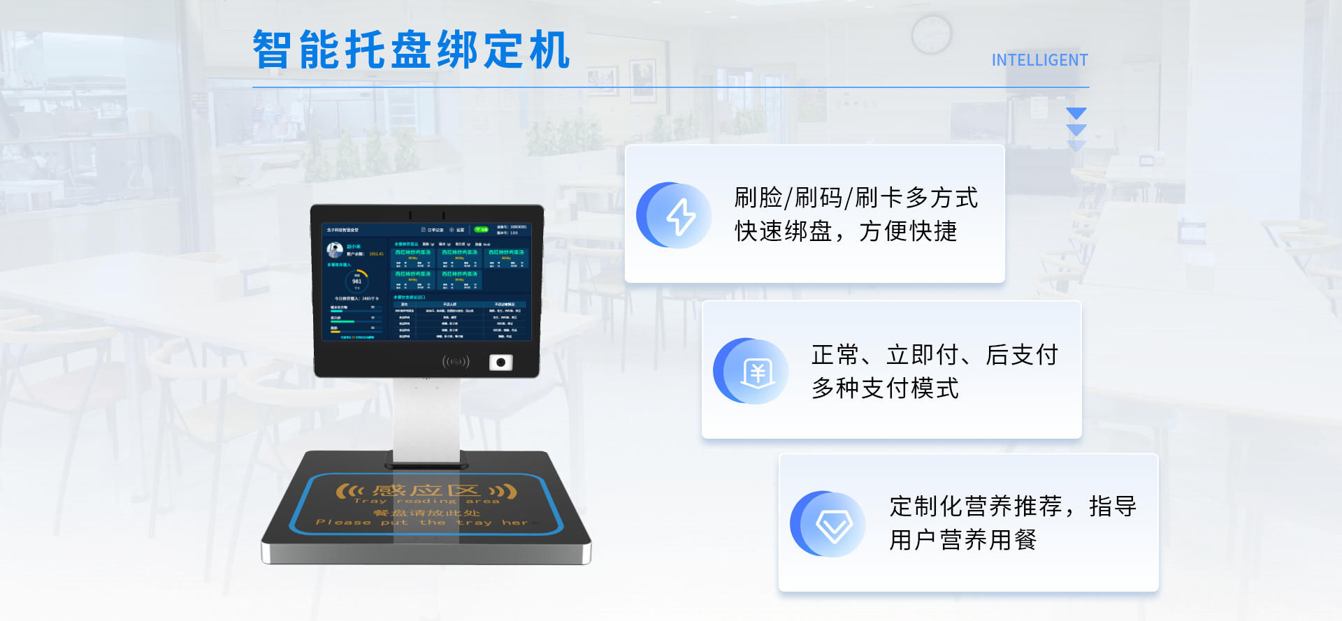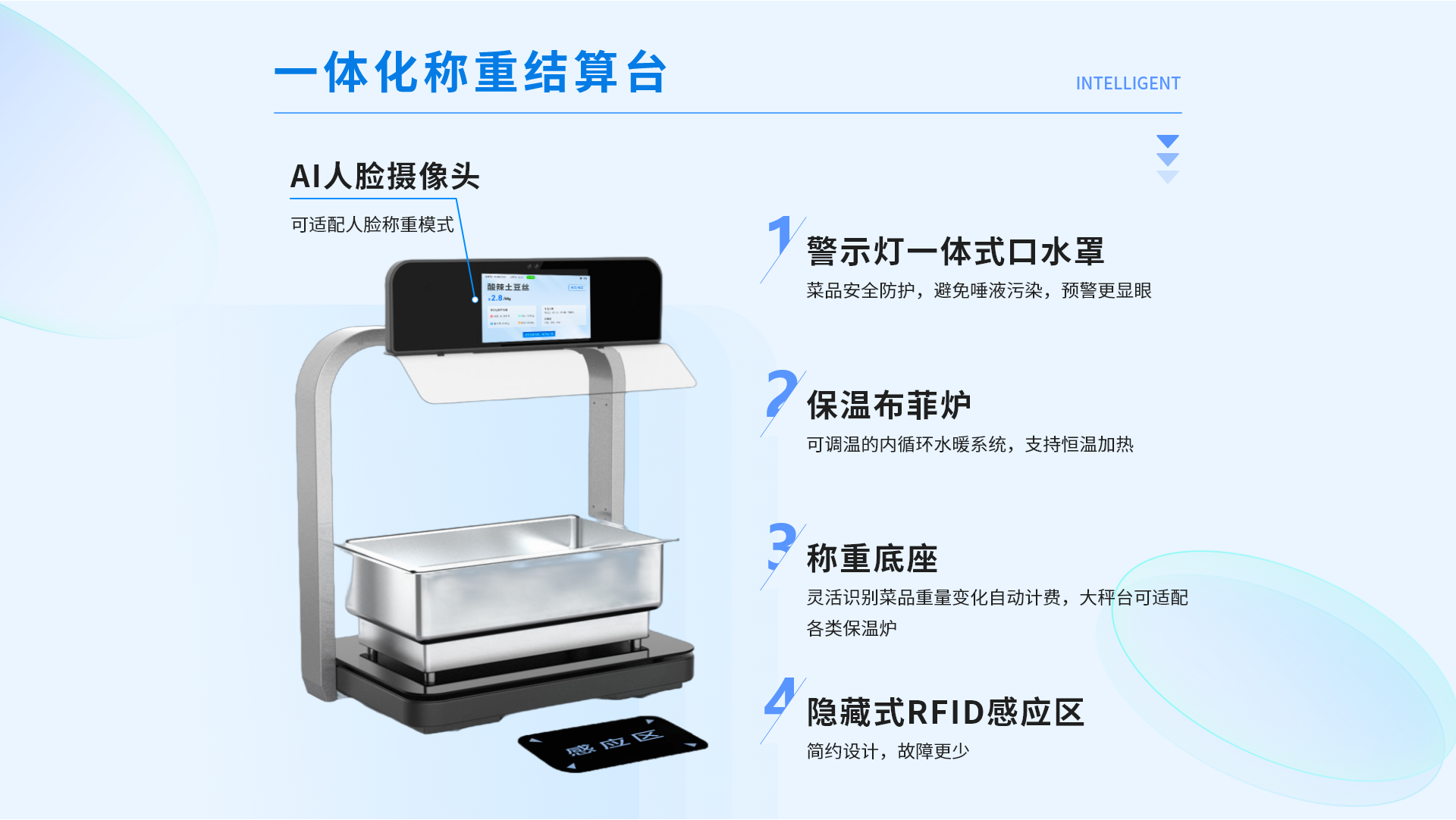 智能稱重結(jié)算臺一體化設(shè)計,基于餐飲云平臺為就餐者提供的無感支付、自助餐飲的智能化集成式系統(tǒng)。用戶綁定托盤后,通過托盤感應(yīng)臺讀取托盤信息,即可在多個智能秤上自助稱重取餐,取餐完成后通過空中支付進(jìn)行就餐結(jié)算。