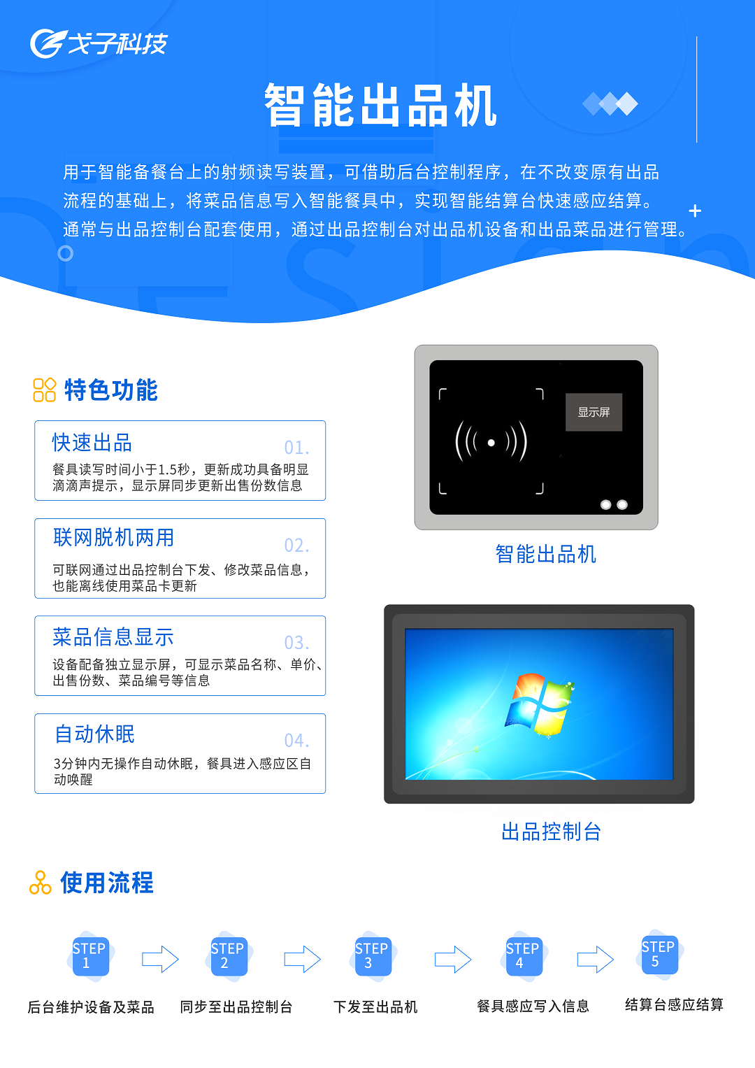 戈子科技智能出品機(嵌入式)是嵌入在智能備餐臺上的射頻讀寫裝置,可借助后臺控制程序,在不改變原有出品流程的基礎上,將菜品信息寫入智能餐具中,以實現智能結算臺通過芯片感應寫入的菜品信息進行快速結算。通過智能出品管控系統,可以統一餐盤顏色,減少餐盤分類分揀,減少后廚人員清洗工作量。