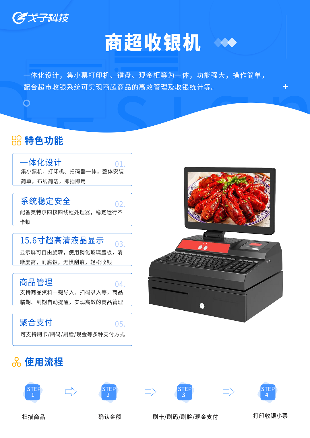戈子科技商超收銀機是一款一體化設計收銀機,集小票打印機、鍵盤、現金柜等為一體,功能強大,操作簡單,配合超市收銀系統可實現商超商品的高效管理及收銀統計等功能,實現智能商超管理。
